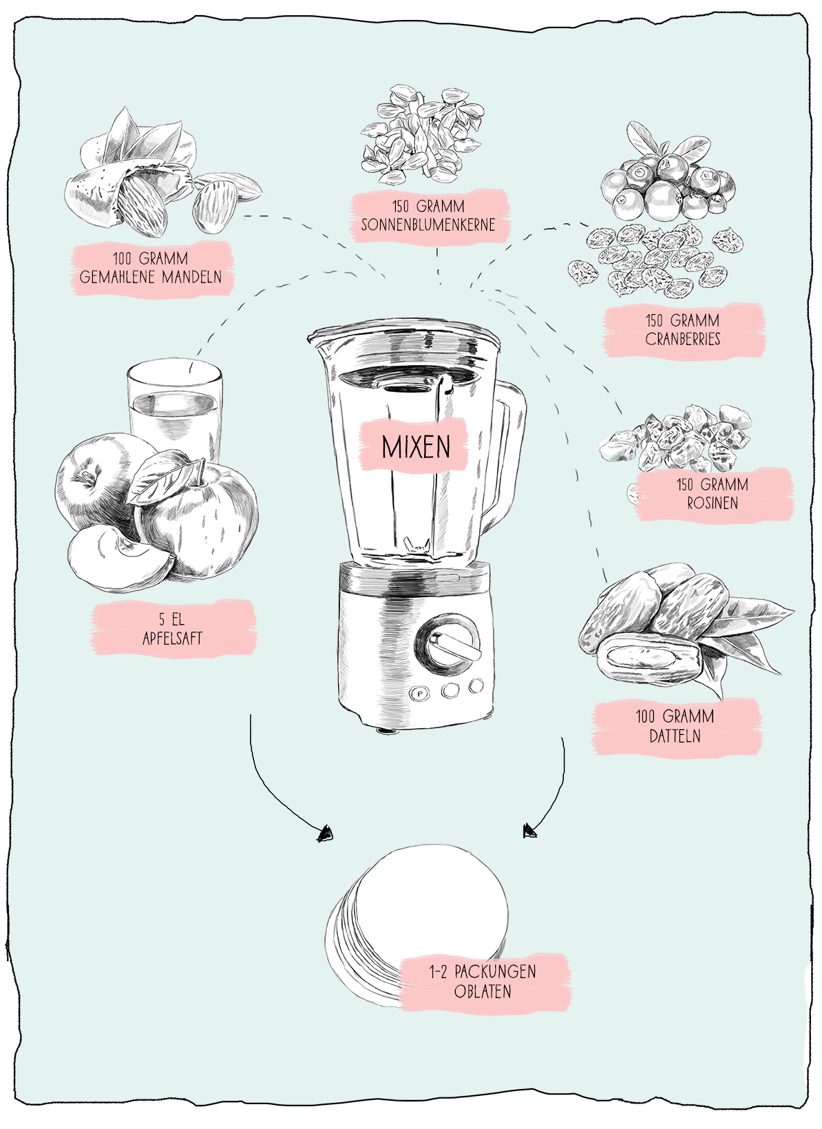 Alles in eine Schüssel geben und vermischen, anschließend Mixen und auf die Oblaten geben. Etwas zusammendrücken. Fertig!